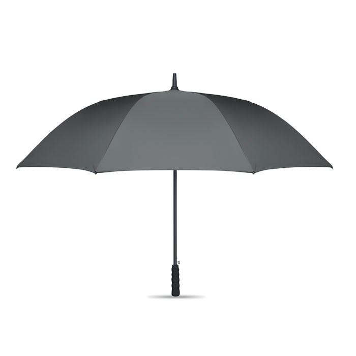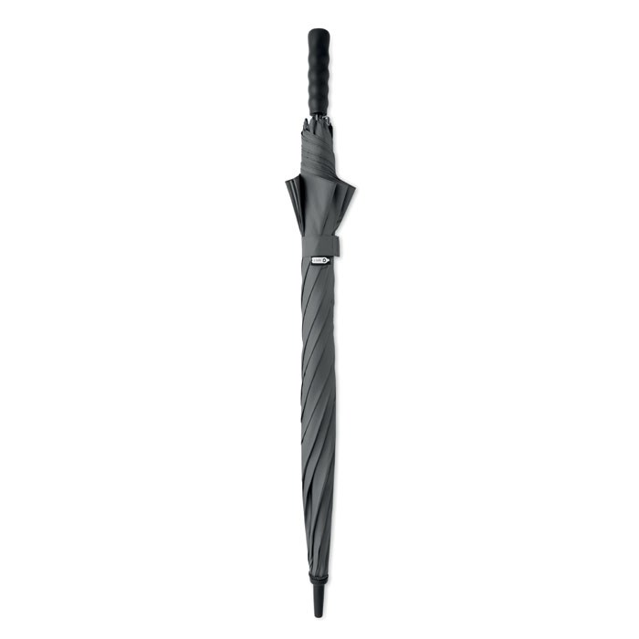 Parapluie coupe-vent 27 pouces à ouverture automatique en pongé RPET 190T. Mât et baleines en fibre de verre. Poignée en paille de blé et ABS recyclée. Embouts et capuchon en plastique.