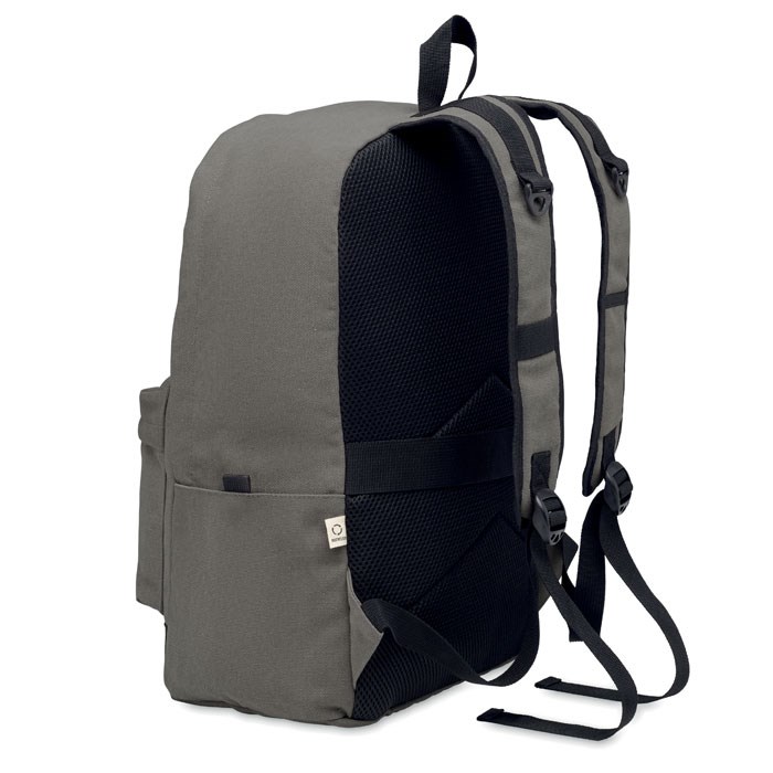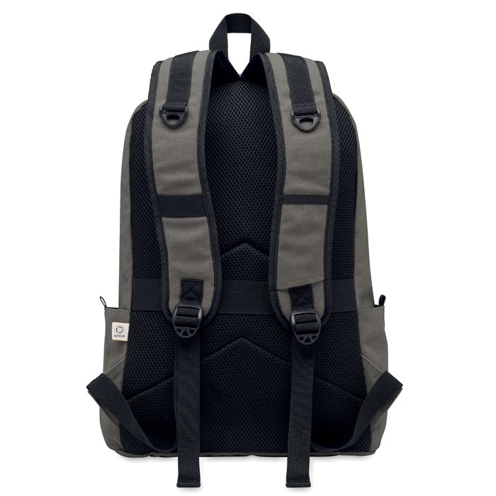 Sac à dos pour ordinateur de 15'' en coton recyclé de préconsommation. Grande poche frontale zippée avec compartiment intérieur pour ordinateur . Petite poche frontale zippée. 2 poches latérales à glissière. Dos et bretelles, panneau arrière et fond rembourrés 450g/m².