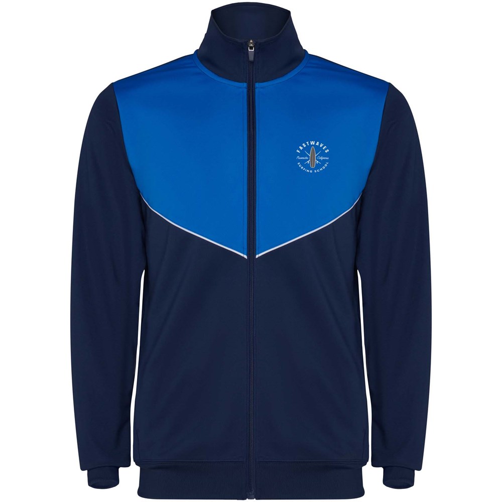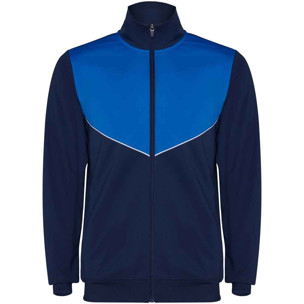 Survêtement en tissu léger et élastique. Veste avec couleur contrastée et finitions cousues sur la poitrine. Col montant avec coutures contrastées. Fermeture à glissière centrale sur le devant. Poches latérales. Poignets et taille côtelés 2x2. Pantalon avec ceinture élastique et cordon de serrage. Pièce latérale contrastée avec finition cousue. Ourlet zippé.