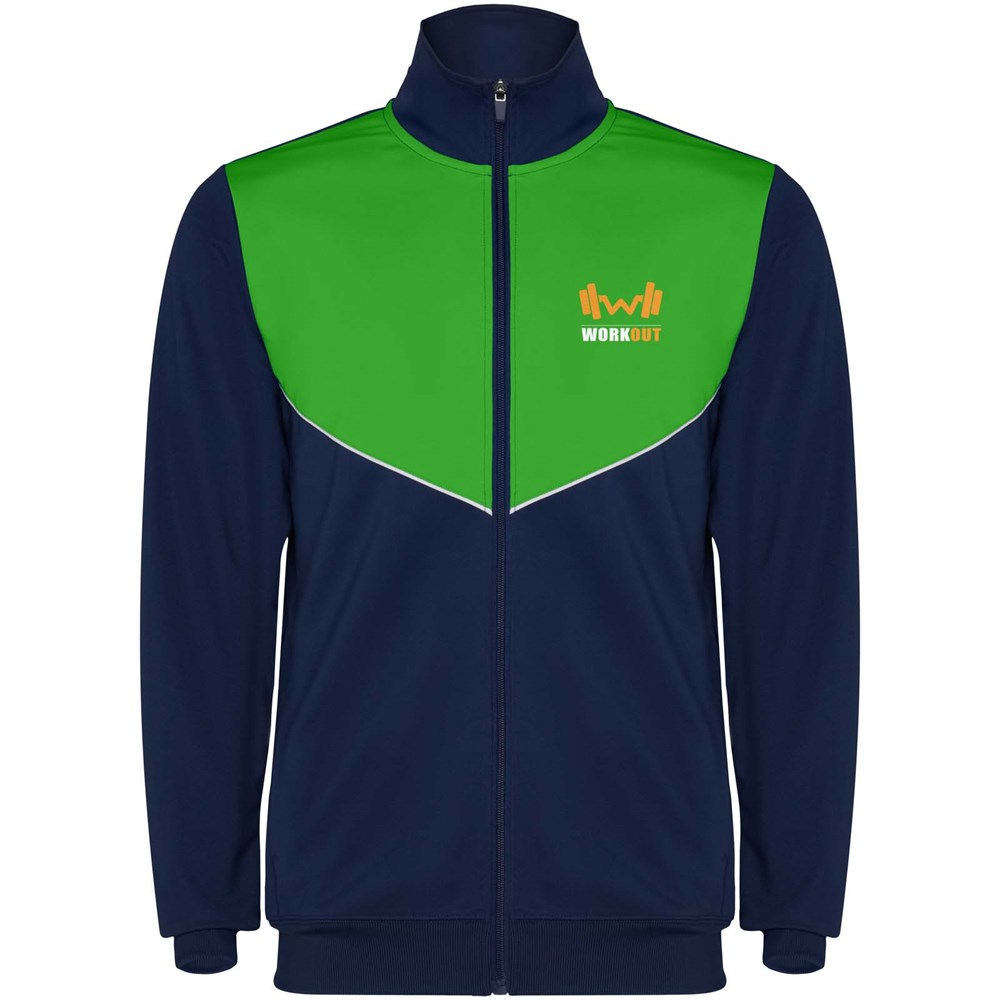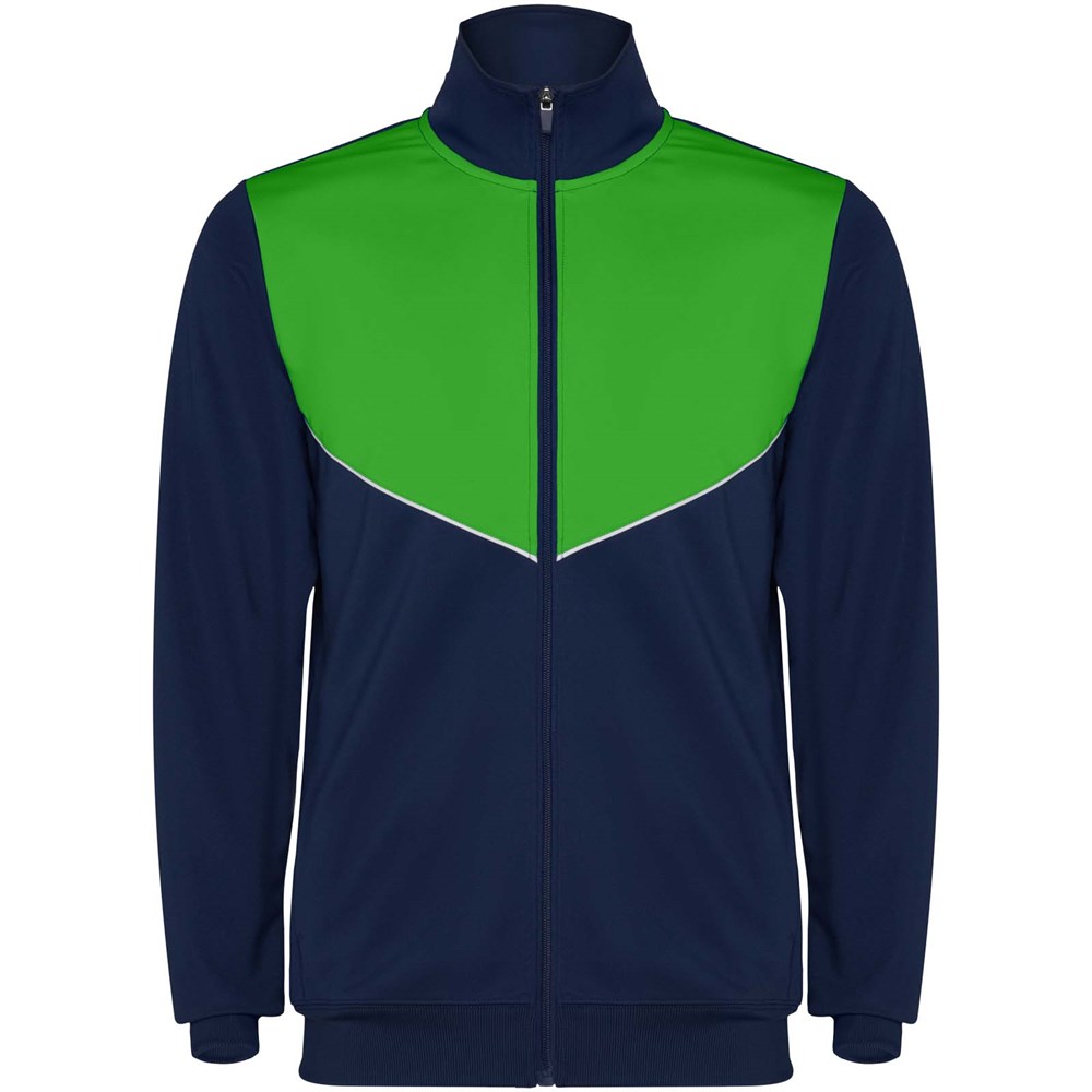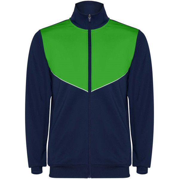 Survêtement en tissu léger et élastique. Veste avec couleur contrastée et finitions cousues sur la poitrine. Col montant avec coutures contrastées. Fermeture à glissière centrale sur le devant. Poches latérales. Poignets et taille côtelés 2x2. Pantalon avec ceinture élastique et cordon de serrage. Pièce latérale contrastée avec finition cousue. Ourlet zippé.