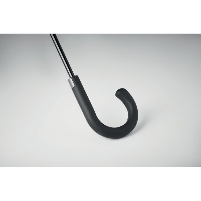 Parapluie coupe-vent 23 pouces à ouverture automatique en pongé 190T et motif intérieur à carreaux. Mât en fibre de verre, manche plaqué noir et embouts en plastique. Poignée incurvée en caoutchouc. Fermeture manuelle.