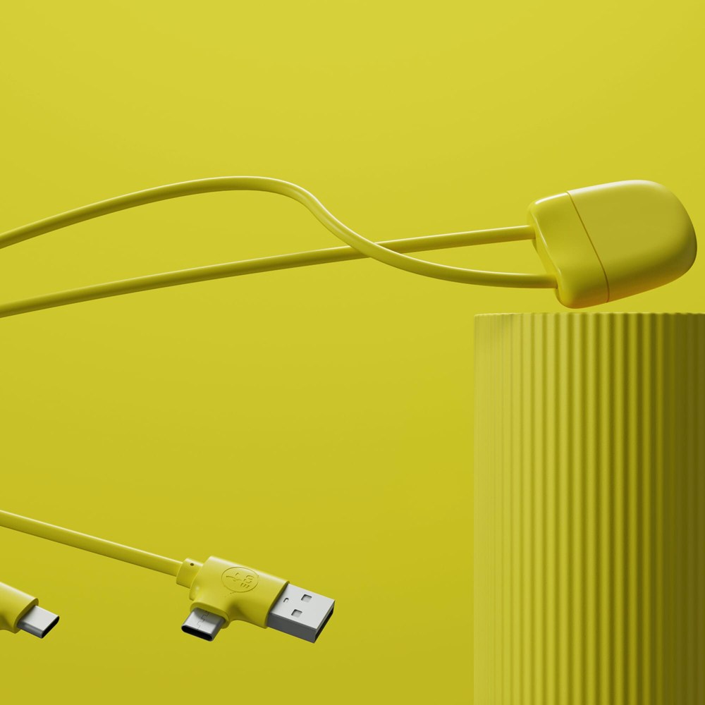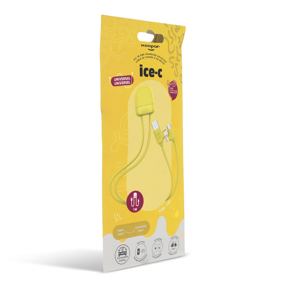 Le câble de charge ICE-C 27Watt est notre dernier câble de charge multiple, avec une double entrée USB & USB-C et une double sortie USB-C & Lightning. Le câble a une longueur de deux fois 50 cm et prend en charge le transfert de données et la lecture en voiture. Le contenu recyclé total est de 55% basé sur le poids de l'article. Le câble est emballé dans une enveloppe en papier durable certifiée FSC.