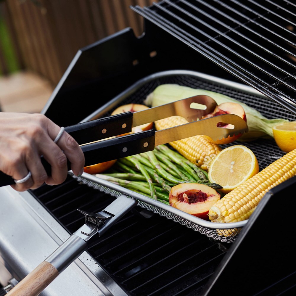 Les ustensiles de barbecue Fredde BBQ de Sagaform ont un design pratique en acier inoxydable avec des poignées en bois teintées en noir et une bonne prise en main pour une utilisation facile, parfaite pour un barbecue.