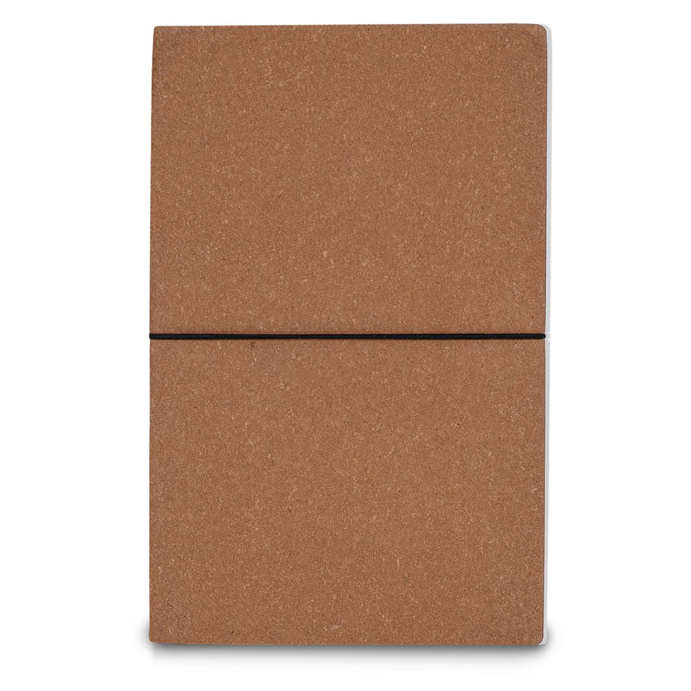 Carnet avec aspect naturel. La couverture est en cuir recyclée très résistante. Le carnet contient 160 pages de couleur crème et un ruban marque pages. Il se ferme à l'aide d'une élastique.