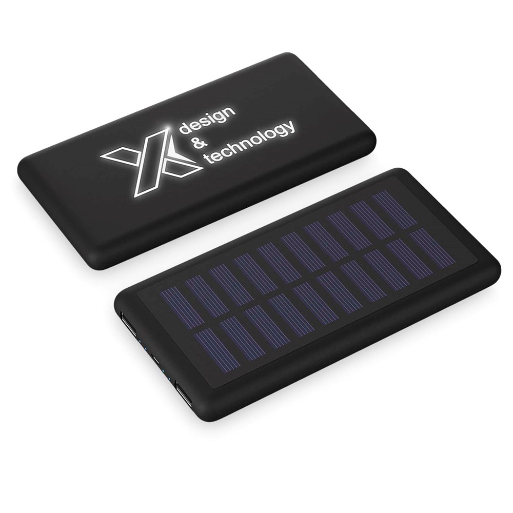 Batterie de secours 8 000 mAh solaire et lumineuse avec câble 3 en 1 en RPET (Type C, Android, iPhone). Le panneau solaire est en monocrystalline. L'appareil s'allume pendant 30 secondes quand on le touche ou quand il est en cours de charge. Capacité : 8000 mAh Entrée : 5 V/1 A USB. Sortie : 5 V/2 A. Durée de charge solaire / lumière artificielle : 240 mAh/heure (environ 27 heures pour une charge complète). La charge peut également être effectuée avec le câble fourni. Dimensions : 153 × 76 × 13,5 mm. Livrée avec une boîte cadeau en papier recyclé.