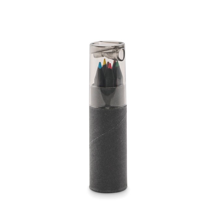Tube en papier noir contenant 6 crayons de couleur et un taille-crayon intégré dans le capuchon.