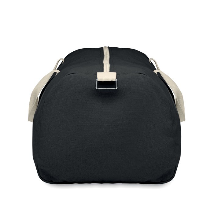 Sac de sport en tissus recyclés (60% coton recyclé, 40% polyester recyclé) en 320 gr/m² avec poignée en sangle de coton naturel et une bandoulière réglable et amovible.