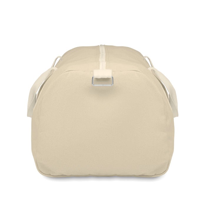 Sac de sport en tissus recyclés (60% coton recyclé, 40% polyester recyclé) en 320 gr/m² avec poignée en sangle de coton naturel et une bandoulière réglable et amovible.