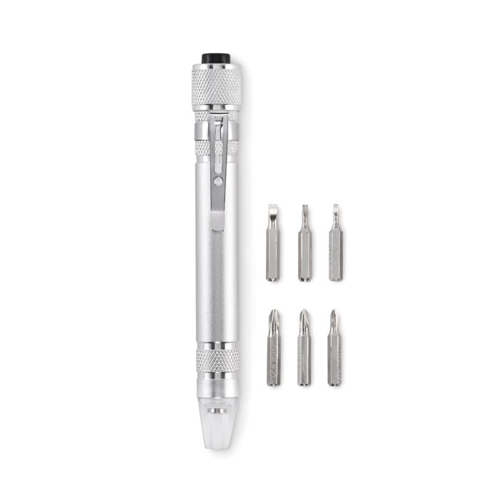 Outil multifonction en aluminium recyclé en forme de stylo avec lampe. Comprend 3 têtes de tournevis plats et 3 têtes de tournevis cruciformes. 4 piles bouton LR41 incluses.