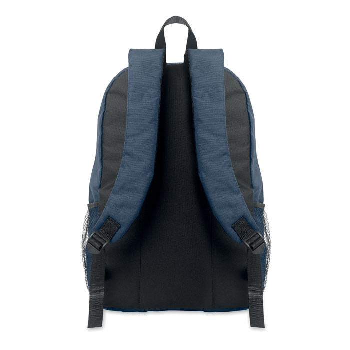 Sac à dos en polyester 600D RPET avec cordon et poche frontale zippée. Poches en filet sur les deux côtés.