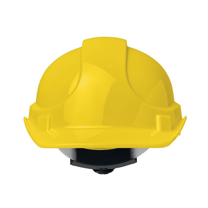 Casque de sécurité ajustable en ABS pour chantier et industrie. Équipé de ventilations, d'une jugulaire amovible et d'un bandeau anti-transpiration. Tour de tête réglable (51-63cm). EN397.