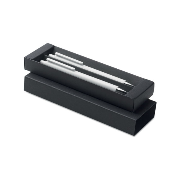 Parure de stylos en aluminium recyclé comprenant 1 stylo bille à poussoir (encre bleue) et 1 stylo graphite sans encre. Présentée dans une boîte en papier recyclé.