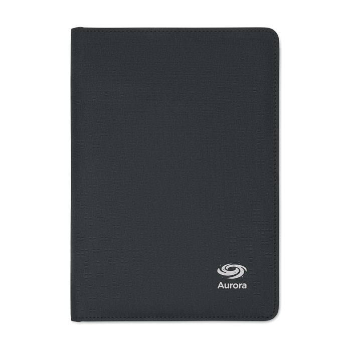 Conférencier A5 en 300D RPET 2 tons. Bloc-notes A5 remplaçable. 40 pages blanches lignées en papier bambou (20 feuilles). Porte-stylo. Porte-cartes à l'intérieur et un grand compartiment.