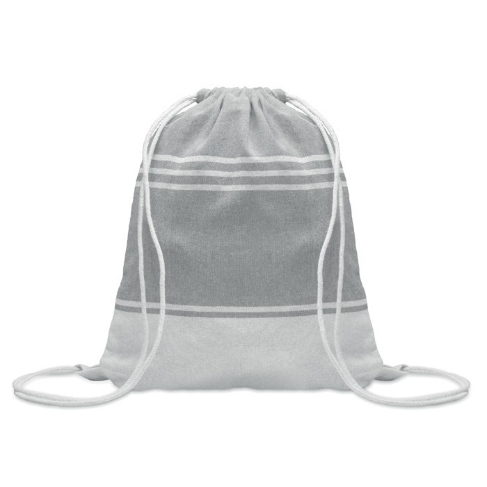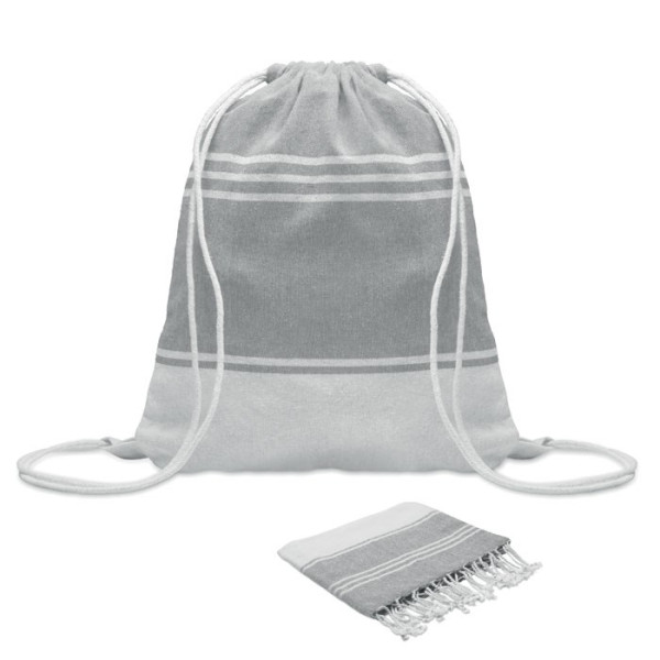 Fouta avec sac à cordon assorti. 70% coton recyclé et 30% polyester recyclé 180 gr/m². Fouta 90x160 cm.