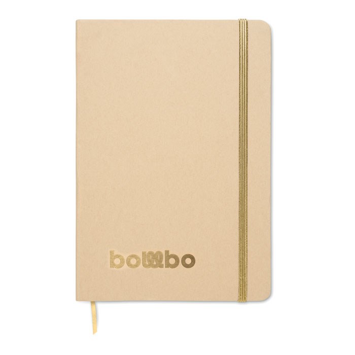 Carnet A5 avec couverture rigide en carton recyclé. Couverture beige. 160 pages lignées en papier recyclé (80 feuilles). Fermeture élastique, marque-page assorti à la couleur révélée. La couleur est révélée après la gravure au laser. FSC®-certified | FSC MIX CREDIT, P7.1, FSC-C213206