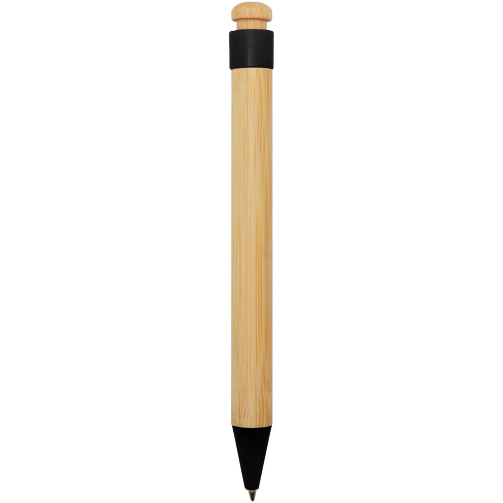 Stylo bille dont le clip et la pointe sont en plastique recyclé, et dont le bouton et le corps sont en bambou. Couleur de l'encre : Noire. Longueur d'écriture : 1000 mètres. Taille de la plume : 1,0 mm.