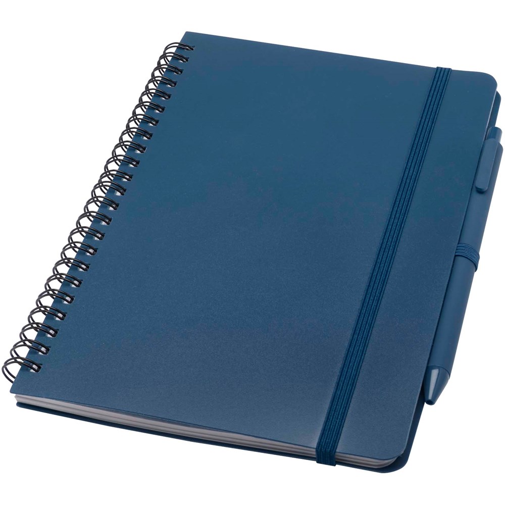Le carnet à couverture rigide Thalaasa A5 est fabriqué en plastique océanique recyclé et contient 80 feuilles lignées de papier crème de 70 g/m². Il comporte des coins arrondis, une fermeture élastique et une boucle pour stylo. Le stylo bille à encre noire est également fabriqué à partir de plastique océanique recyclé. Longueur d'écriture : 1000 mètres. Taille de la plume : 1,0 mm.