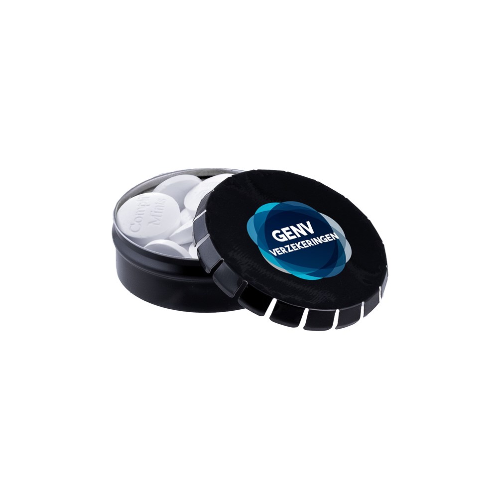 Mini clic-clac blikje zwart met ca. 23 gram Compli'mints, voorzien van een full colour bedrukking. Inclusief ingrediëntensticker en seal.