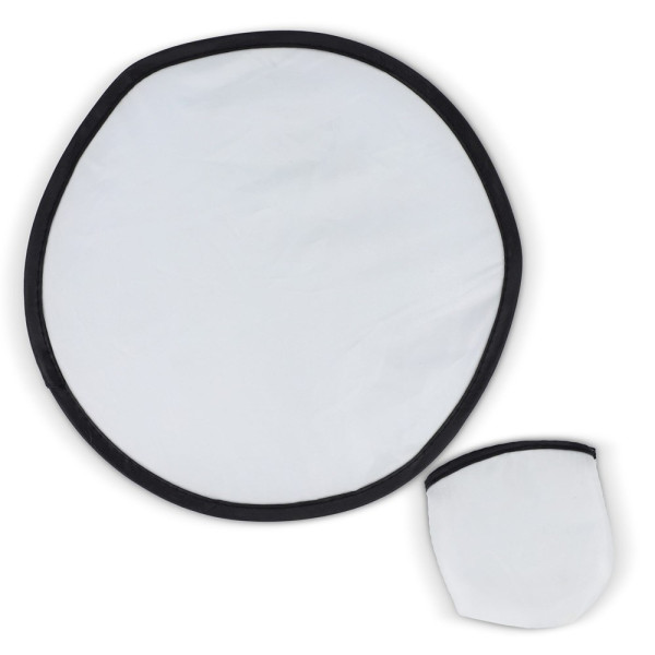Frisbee pliable en PET 190T 100% recyclé dans une pochette. Personnalisez ce produit avec un design en sublimation couleur. Taille de la pochette : 100x90mm