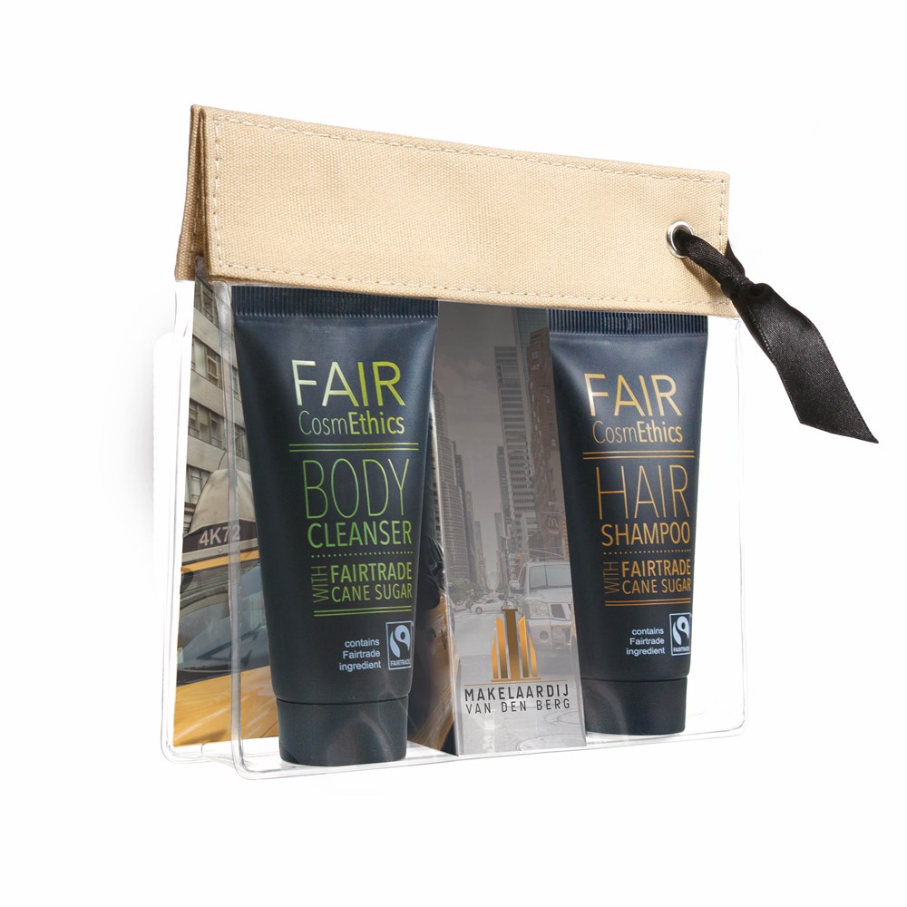 30 ml douchegel en 30 ml shampoo in een luxe toilettas met drukknoopsluiting.