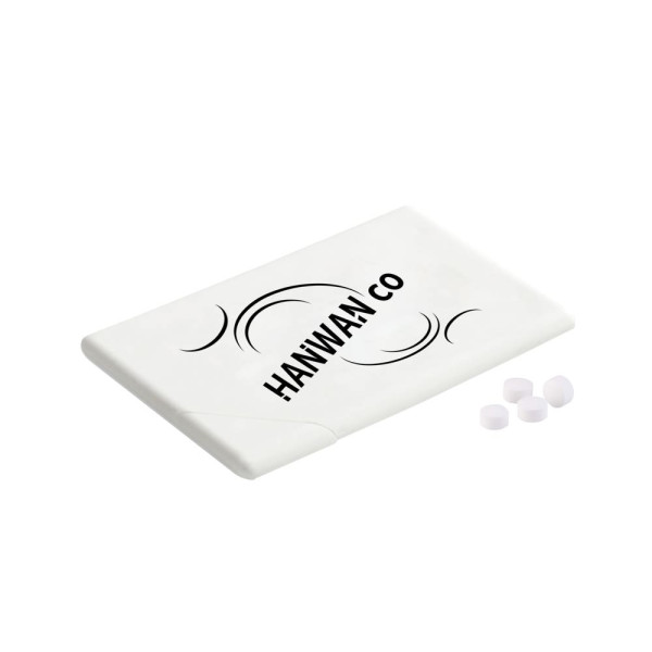 Witte mint dispenser in de vorm van een creditcard, voorzien van een bedrukking in 1 of 2 kleuren op de bovenzijde, gevuld met ca. 8 gram suikervrije pepermuntjes, zonder Aspartaam