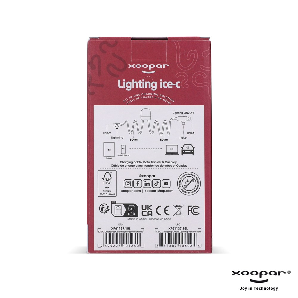 Découvrez le câble de charge Xoopar Light up ! Long de 2x 50cm, idéal pour une charge fluide et la fonctionnalité CarPlay. Double entrée/sortie, charge rapide jusqu'à 27W. La vitesse de la LED indique la vitesse de charge. Fabriqué en plastique recyclé. Les produits Xoopar ne peuvent pas être vendus en France et en Espagne.