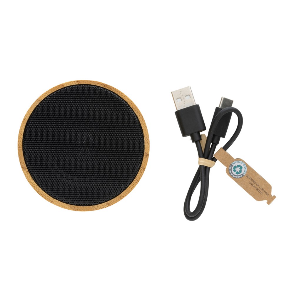 Haut-parleur sans fil 3W fabriqué avec un boîtier 100% bambou FSC® et de l'ABS recyclé certifié RCS (Recycled Claim Standard). Contenu recyclé total : 16 % sur la base du poids total de l'article. La certification RCS garantit une chaîne d'approvisionnement entièrement certifiée pour les matériaux recyclés. L'enceinte est dotée d'une lumière intégrée dans sa partie inférieure. Le haut-parleur est équipé d'une batterie de 300 mAh pour garantir jusqu'à 3 heures d'autonomie et de la technologie BT 4.1 pour une connexion fluide et un son clair. Portée de connexion jusqu'à 10 mètres. Avec micro pour répondre aux appels. Emballé dans une boîte FSC® mix. Câble de chargement en TPE recyclé certifié RCS inclus. Article et accessoires 100% sans PVC.