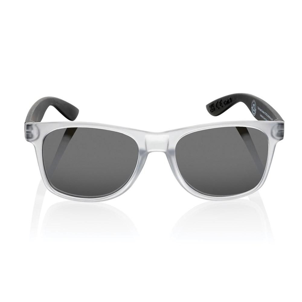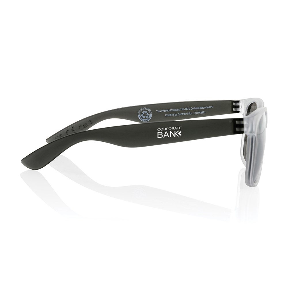 Lunettes de soleil fabriquées avec une monture en PC transparent recyclé certifié RCS. Avec verres miroirs colorés. Contenu recyclé total : 72 % sur la base du poids total de l'article. La certification RCS garantit une chaîne d'approvisionnement entièrement certifiée pour les matériaux recyclés. Les verres sont conformes à la norme EN ISO 12312-1, UV 400 et CAT 3. Emballées dans une boîte kraft FSC®.
