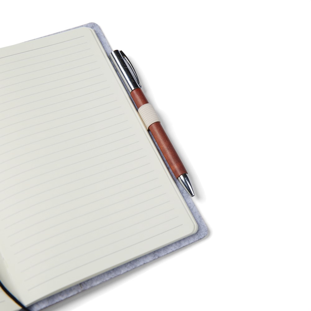 Cahier A5 élégamment fabriqué en feutre recyclé, avec un effet de mélange et un porte-stylo intégré. Contenant 80 feuilles ou 160 pages de papier recyclé 70 g/m², ses pages lignées sont idéales pour la prise de notes. Certifié par GRS (Global Recycled Standard), la certification GRS garantit que l'ensemble de la chaîne d'approvisionnement des matériaux recyclés est certifiée.Le contenu recyclé total est basé sur le poids total du produit.Ce produit contient 83 % de papier recyclé certifié GRS et 7 % de feutre recyclé certifié GRS.