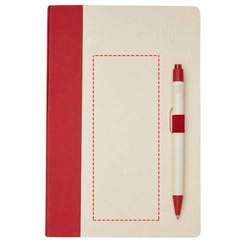 Un ensemble composé d'un carnet de notes format A5 et d'un stylo bille. Le carnet comprend 80 feuilles lignées (80 g/m²) fabriquées à partir de briques de lait recyclées (jusqu'à 70 %), des spirales en papier coloré et une boucle à stylo. La boucle à stylo contient un stylo bille à bouton-poussoir de la même couleur que le carnet. Le corps du stylo est fabriqué à partir des mêmes briques de lait recyclées et le bouton, l'attache et la pointe sont en plastique PLA coloré. Le stylo contient une recharge noire. Les briques de lait usagées sont collectées, triées, traitées et transformées en papier, transformant ainsi les déchets en quelque chose d'utile.