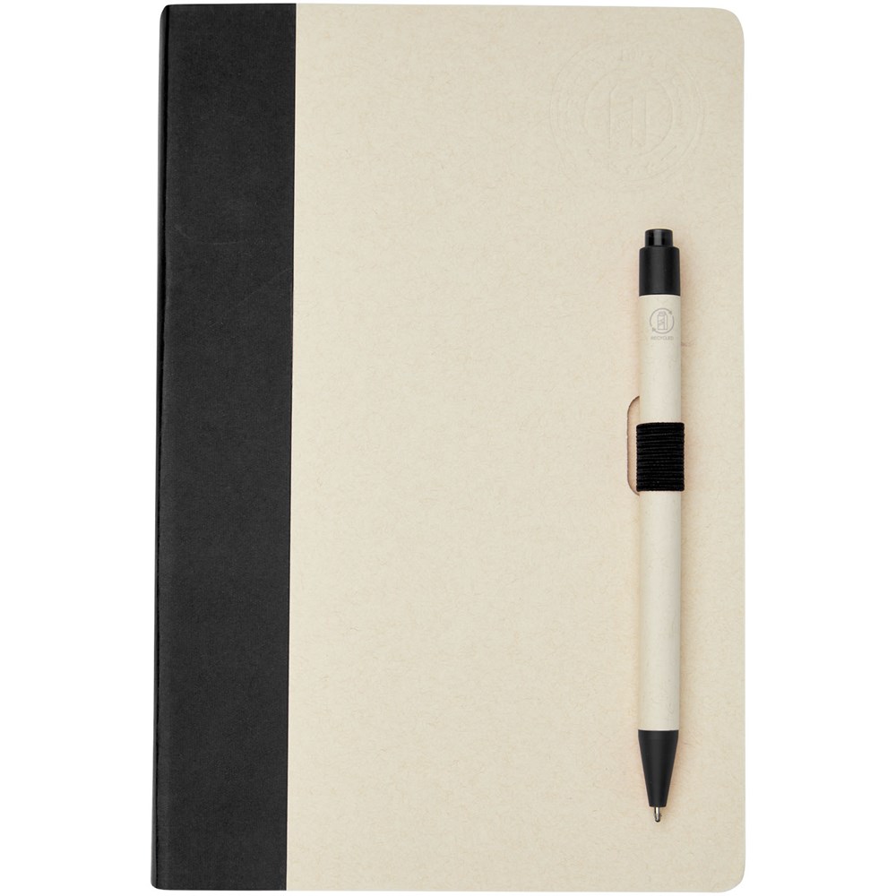 Un ensemble composé d'un carnet de notes format A5 et d'un stylo bille. Le carnet comprend 80 feuilles lignées (80 g/m²) fabriquées à partir de briques de lait recyclées (jusqu'à 70 %), des spirales en papier coloré et une boucle à stylo. La boucle à stylo contient un stylo bille à bouton-poussoir de la même couleur que le carnet. Le corps du stylo est fabriqué à partir des mêmes briques de lait recyclées et le bouton, l'attache et la pointe sont en plastique PLA coloré. Le stylo contient une recharge noire. Les briques de lait usagées sont collectées, triées, traitées et transformées en papier, transformant ainsi les déchets en quelque chose d'utile.