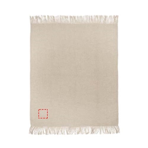 Couverture en RPET ultra-doux certifié GRS, enveloppée d'un ruban RPET 190T. Emballée dans un sac en polyéthylène recyclé. Longueur des franges : 10 cm de chaque côté. Dimensions du ruban : 72 cm x 4 cm.