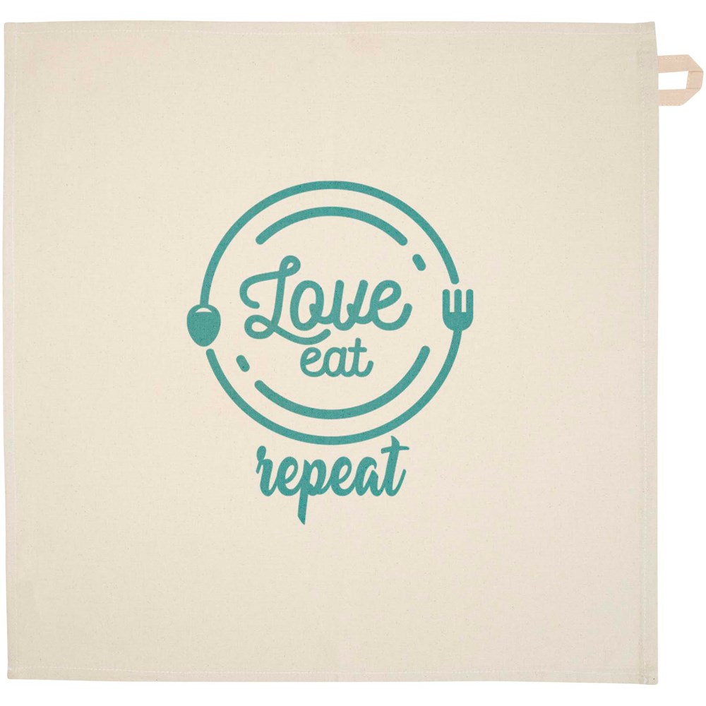 Torchon de cuisine en coton recyclé 200 g/m² certifié GRS et doté d'une boucle contrastée. Dimensions du torchon : 50 x 50 cm.