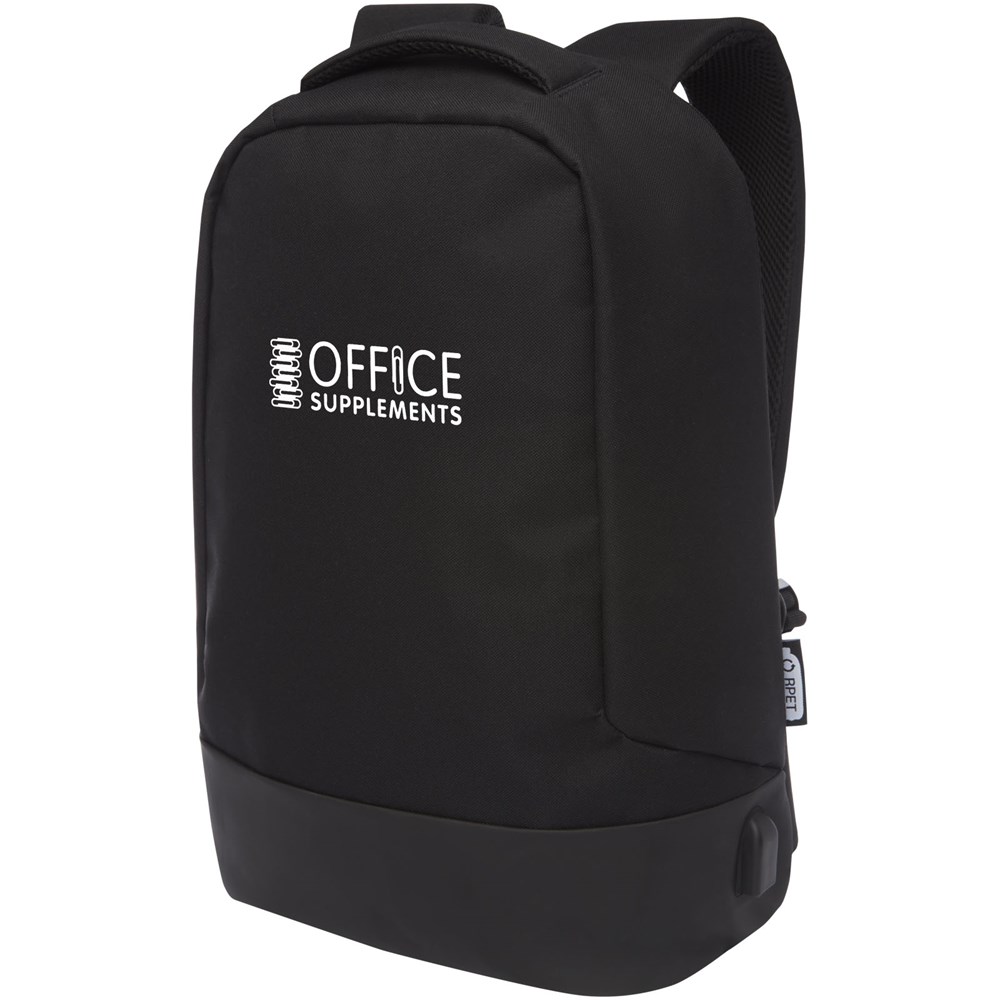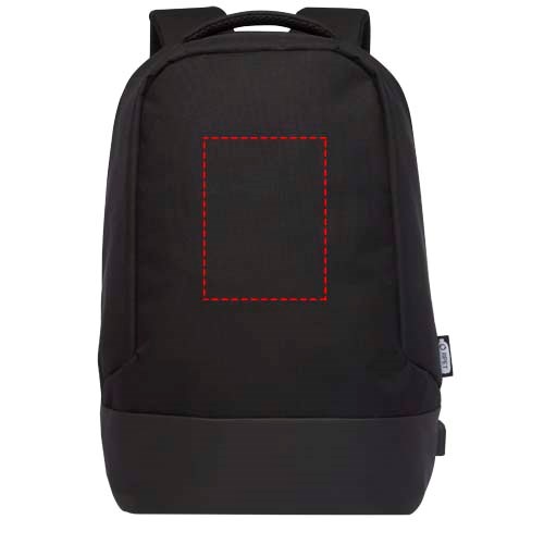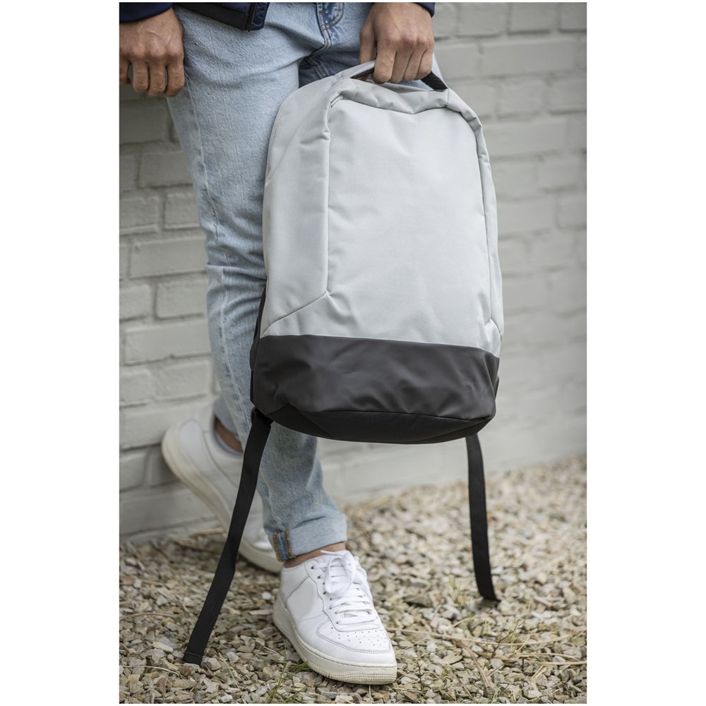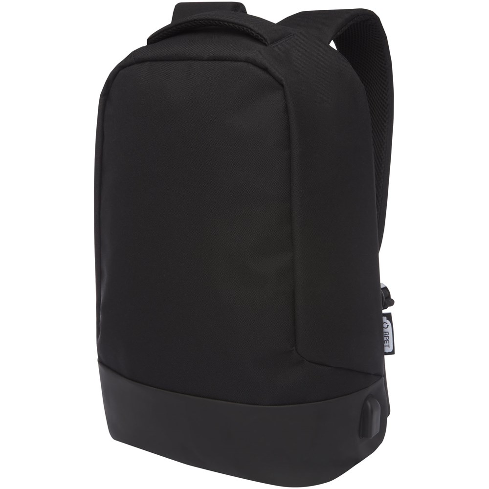 Ce sac à dos en RPET certifié GRS comprend un compartiment principal ouvert avec panneau d'organisation, une housse matelassée pour ordinateur portable de 15” et deux poches de protection RFID. Port USB sur le côté droit pour connecter et charger facilement les appareils de l'intérieur. Il est équipé de bandoulières matelassées, d'une bandoulière droite, d'une poche à glissière cachée, d'une poignée et d'un passant pour trolley. Environ 15 bouteilles en plastique ont été recyclées pour fabriquer ce sac.