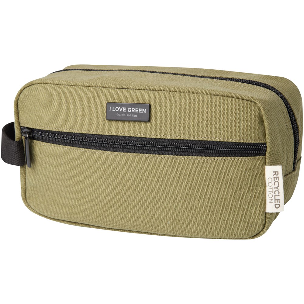 Pochette pour accessoires de voyage en toile recyclée certifiée GRS et doublure en RPET certifiée GRS. Dotée d'une poche frontale zippée et d'un compartiment principal zippé avec des poches de rangement, et d'une sangle confortable. La plaque métallique décorative peut faire briller un logo grâce à sa finition subtile et mate. Capacité : 3,5 litres.
