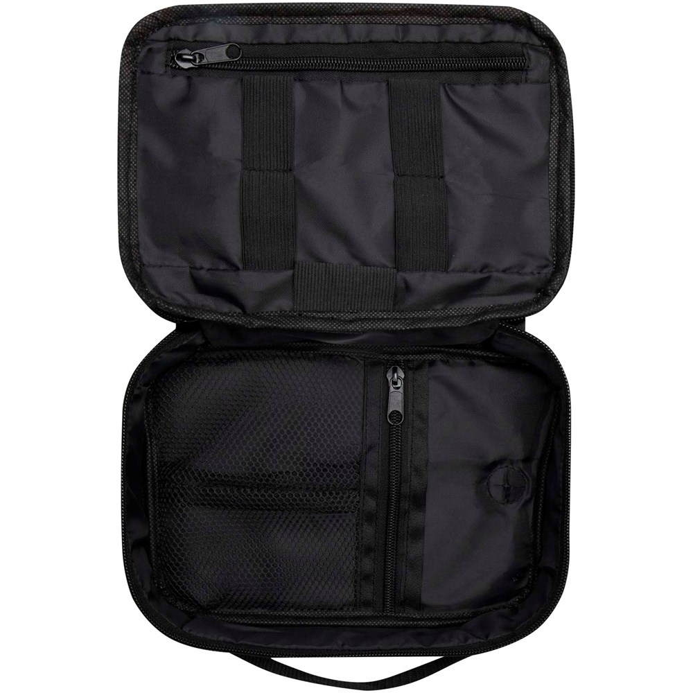 La pochette technique Ross recyclée certifiée GRS est idéale pour les personnes constamment en déplacement, et peut garder les batteries de secours, les câbles de charge, ou tout autre accessoire électronique organisés. Dotée de plusieurs poches, de passants élastiques et d'un patch avec cordon traversant permettant de stocker une batterie de secours à l'intérieur de la pochette tout en chargeant un téléphone. Il dispose également d'un crochet de mousqueton en plastique pour la fixation à un autre sac. Capacité : 1 litre.