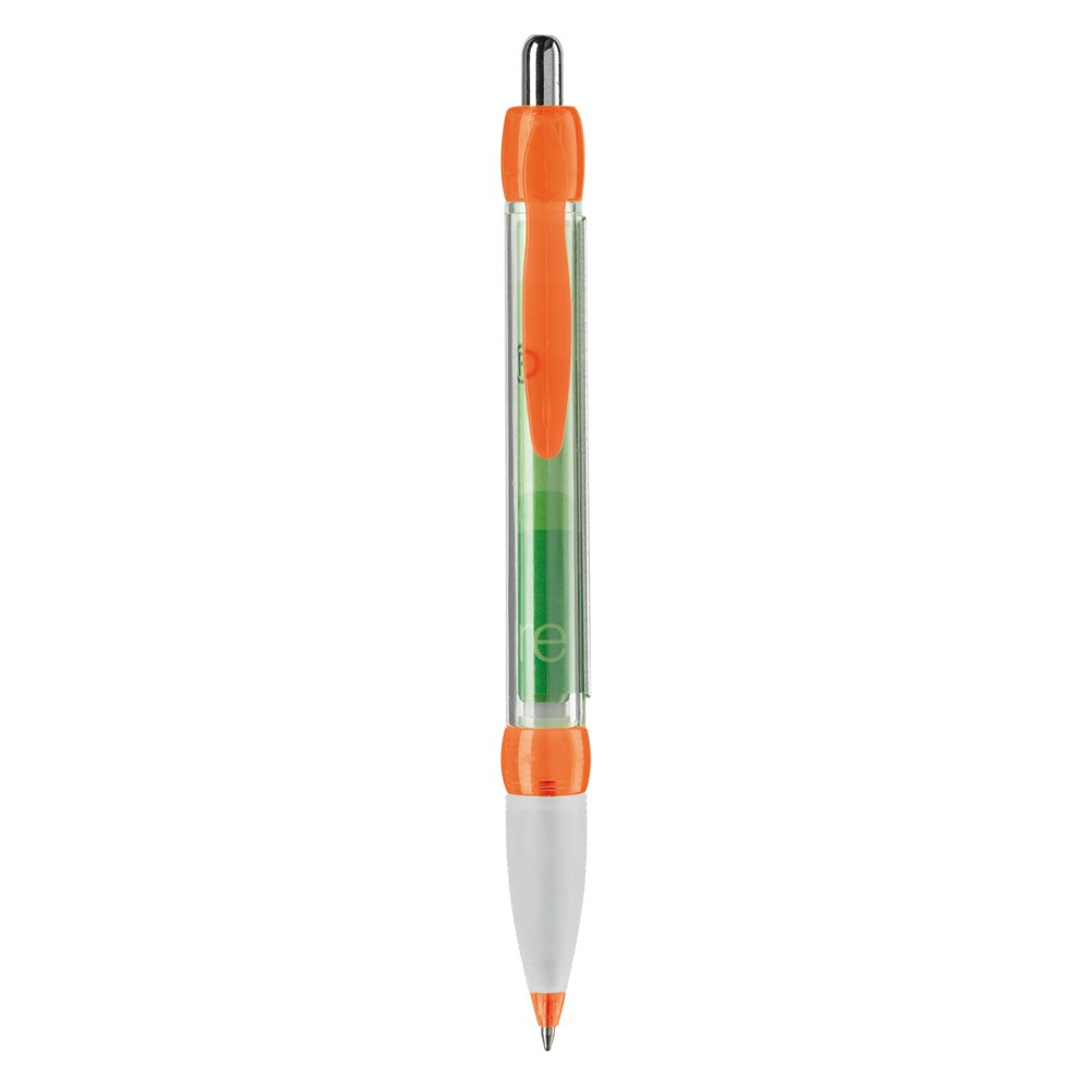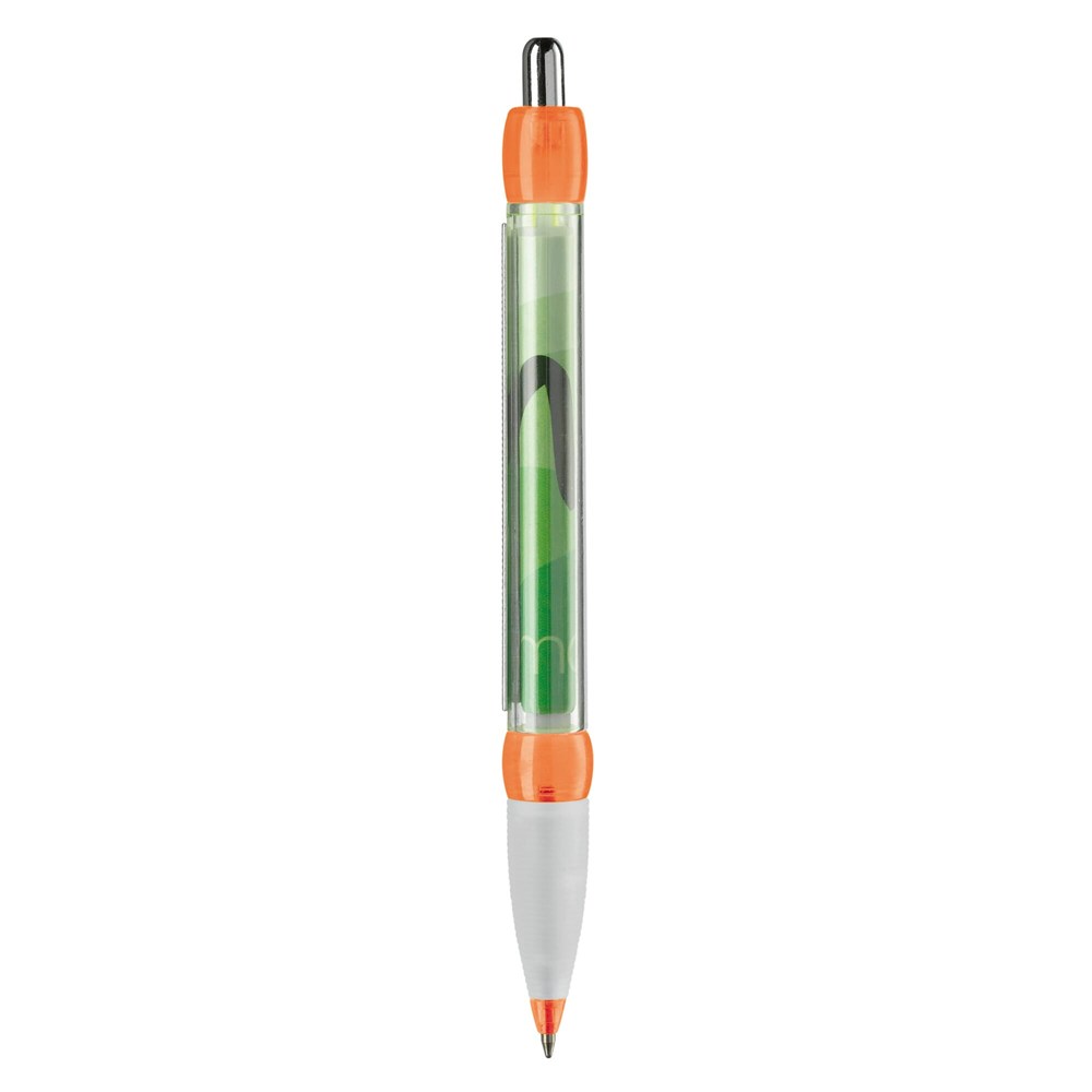 Stylo bille transparent avec grip en caoutchouc. Impression quadri recto-verso sur la bannière. Cartouche d'encre bleue X-20 . Impression sur le clip également possible.
