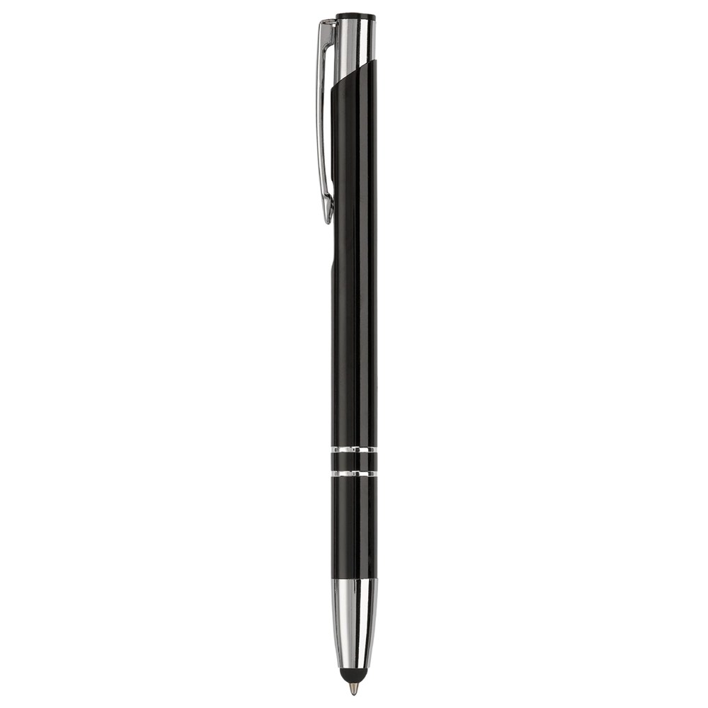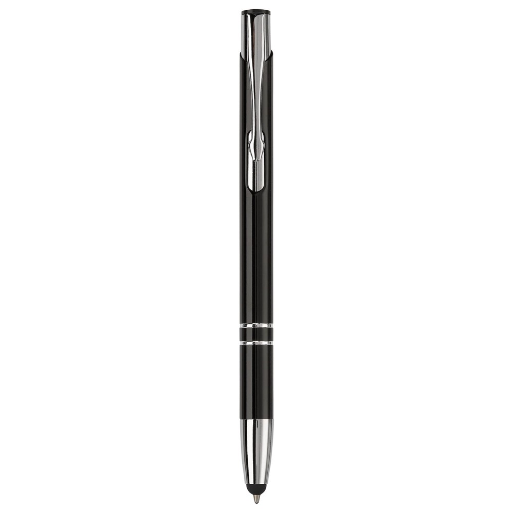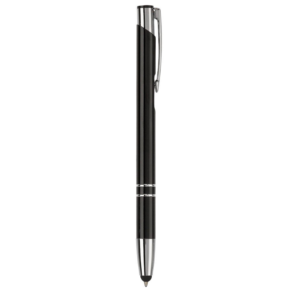 Stylo aluminium élégant avec deux anneaux et incluant la fonction stylet. Ecriture bleue.