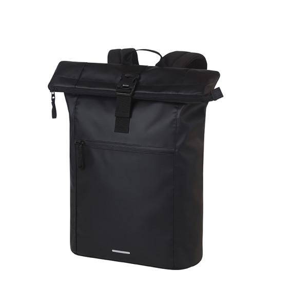 Grote roltoprugzak in koerierstijl; hoofdvak met ritssluiting en extra gesp; groot voorvak met ritssluiting; decoratieve reflecterende opdruk op de voorkant; plat vak binnenin; airtag-vak; notebook-vak, ook toegankelijk vanaf de achterkant; versterkte bodem; gewatteerd draagsysteem met in de hoogte verstelbare borstriem, heupgordel, handgreep