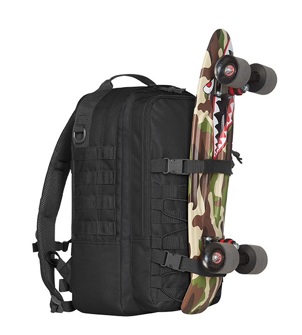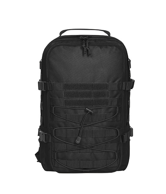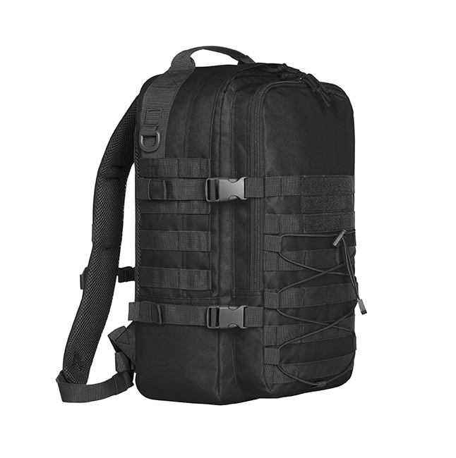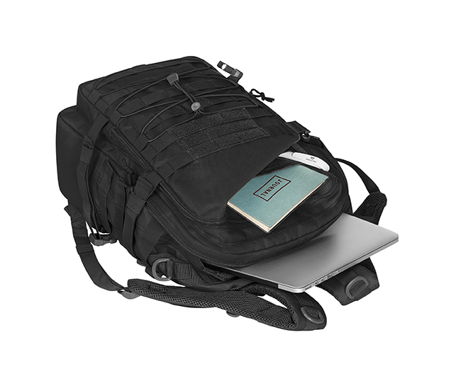 functionele rugzak met 3-zijdig Molle-bandsysteem en klittenband; elastische koord; groot hoofdvak met onopvallende 2-wegritssluiting; gewatteerd notebook-vak met klittenbandklep; uitgang voor kabel of drinkslang; groot gaasvak met rits; voorvak met 2-wegritssluiting en organizer-vakken; compressieriem met gespen; ook afsluitbaar aan de voor- en achterkant, bijv. om vast te maken aan trolleygreep; rechts en links D-ringen; gewatteerd rugdraagsysteem met in de hoogte verstelbare borstriem; D-ring en riemlussen op de draagbanden, in de lengte verstelbare heupgordel, handgreep
