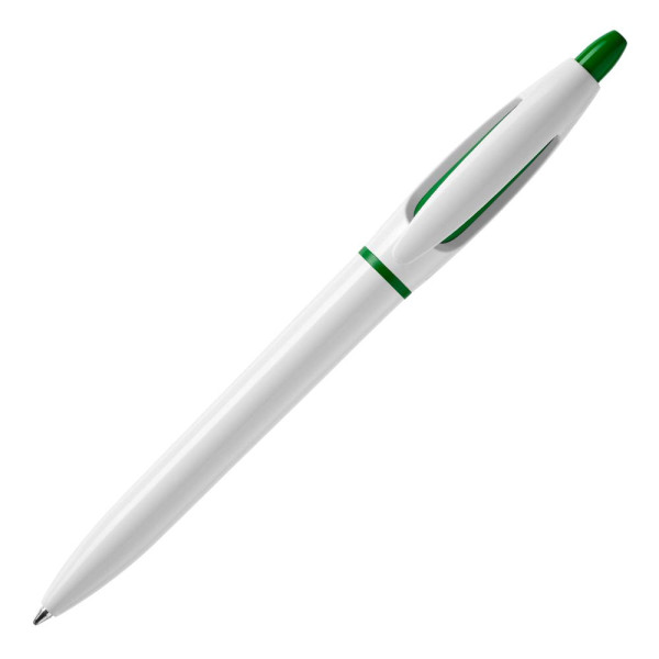 Le stylo bille S! de couleur opaque blanche avec poussoir et anneau colorés inclus une recharge d'écriture bleue X20. Sa cartouche X20 écrit jusqu’à 2.5kms, écriture par défaut bleue. Le stylo est fabriqué en Europe en plastique ABS. À partir de 5.000 pièces, vous pouvez choisir vos propres couleurs.