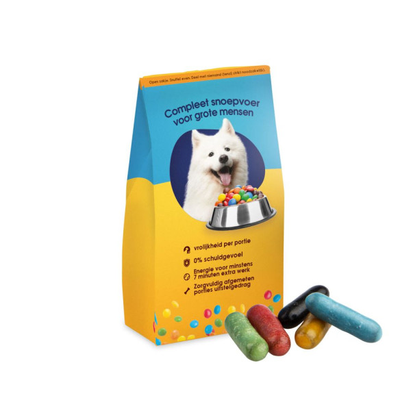 Voerzakje all-over full colour bedrukt, gevuld met ca. 30 gram Dropstaafjes mix