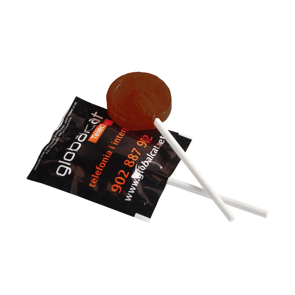 Platte lolly van ca. 5,5 gram in witte folie, met cola smaak, voorzien van een all-over bedrukking aan de voorzijde. De achterzijde wordt repeterend bedrukt of is transparant