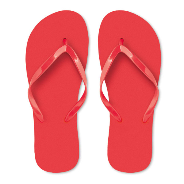 Tongs de plage, semelle en polyéthylène et lanière en PVC. 2 Tailles disponibles, M (entre 36 et 39) ou L (entre 40 et 43).