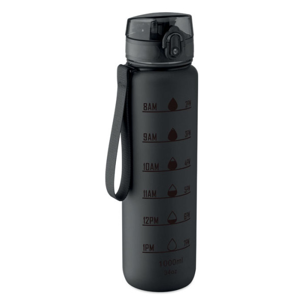 Bouteille de sport en RPET, marqueurs de temps motivants, couvercle à ouverture d'une seule main, fermeture de sécurité et sangle de transport. Anti fuite. Capacité : 1 litre.