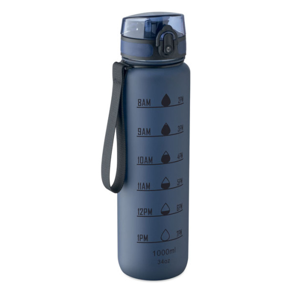 Bouteille de sport en RPET, marqueurs de temps motivants, couvercle à ouverture d'une seule main, fermeture de sécurité et sangle de transport. Anti fuite. Capacité : 1 litre.