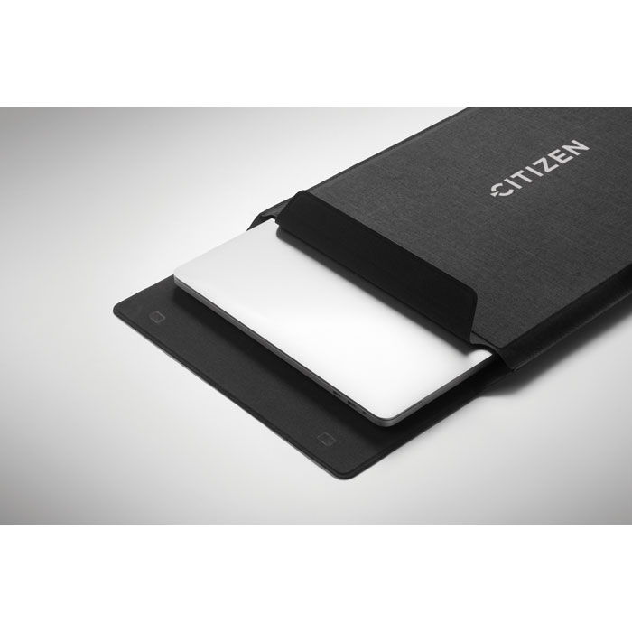 Pochette pour ordinateur portable RPET de 16 pouces avec support pour ordinateur portable et fonctionnalité de tapis de souris lorsqu'elle est dépliée.