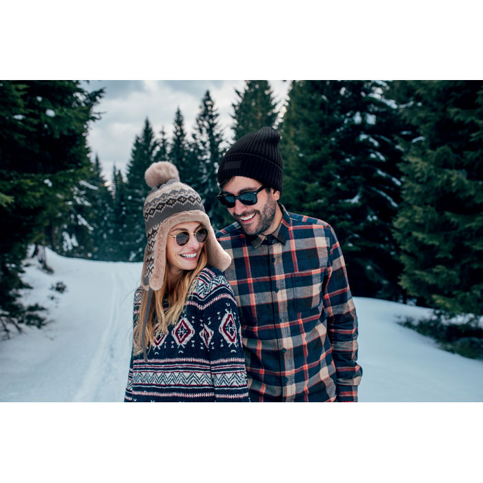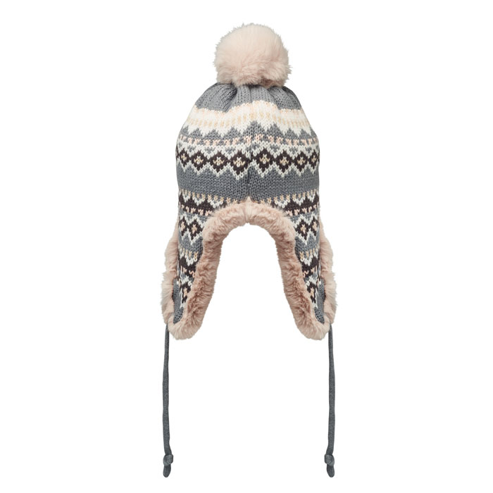 Bonnet tricoté avec oreillettes et pompon en fibre acrylique, doublé de polyester et de polaire. Comprend une étiquette pour la zone d'impression d'un côté. Taille adulte.