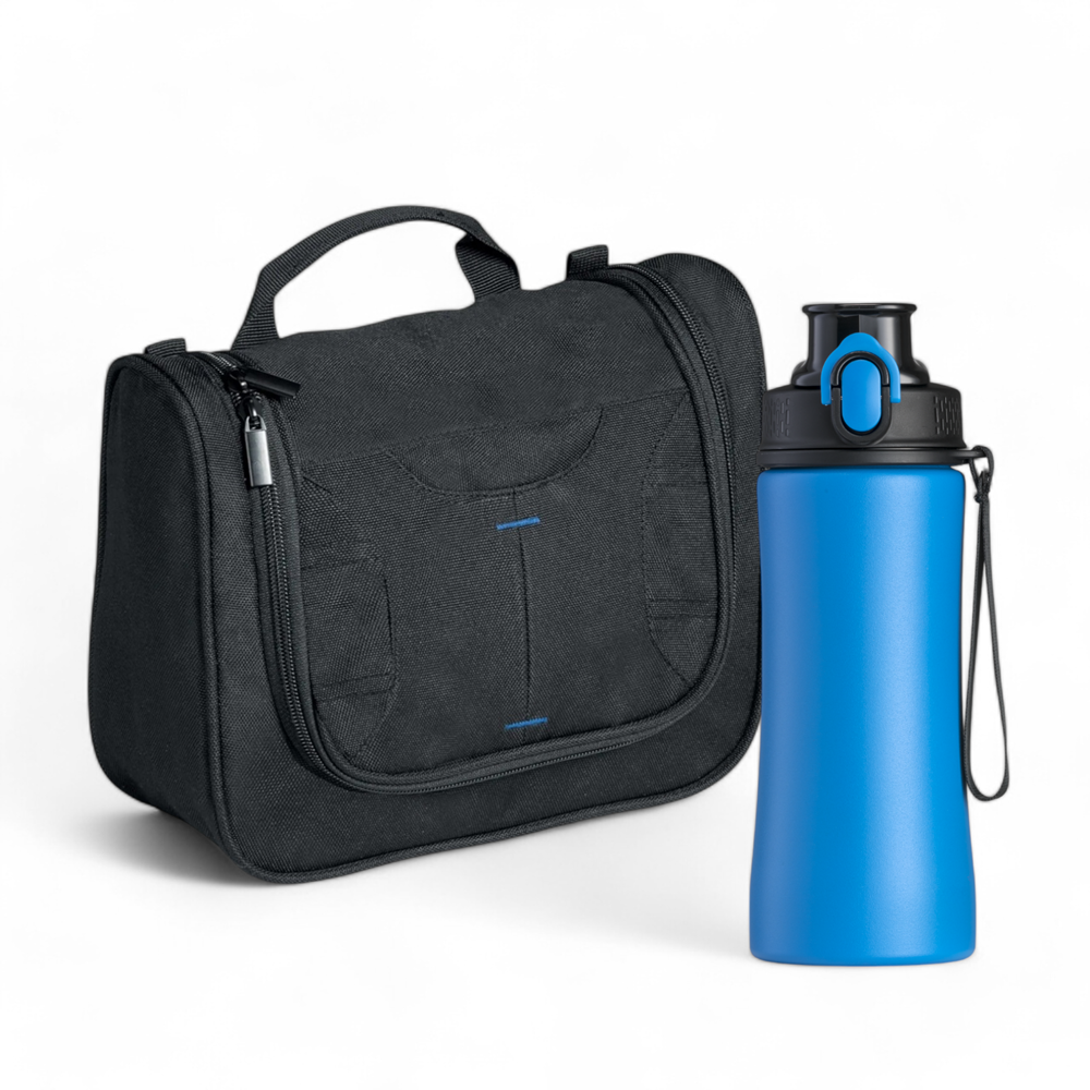 De Primo-set is de perfecte combinatie voor elke reis. De stalen fles, gemaakt van hoogwaardig 18/8 POSCO roestvrij staal, garandeert duurzaamheid en veiligheid. Het ergonomische ontwerp zorgt voor een stevige grip, terwijl het één-klik openingsmechanisme snelle toegang tot uw drankje biedt. De ruime reistoilettas is uitgerust met een groot vak met talrijke verdelers voor cosmetica en medicijnen. Een ritssluiting en een plastic haak maken het gebruik eenvoudig, terwijl de gekleurde stiksels een subtiele elegantie toevoegen. De set is verpakt in elegant folie.