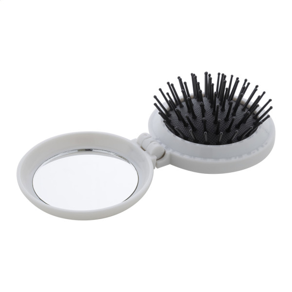 Brosse à cheveux pliable en ABS recyclé avec miroir de poche.